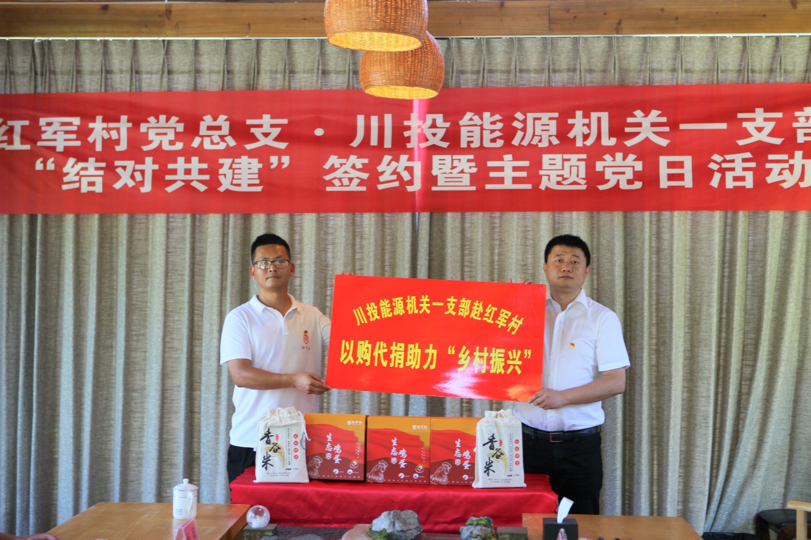 活動現場,雙方簽訂《企地黨支部結對共建協議書》,共同聆聽紅色微黨課,重溫入黨誓詞,重溫紅色記憶、汲取奮進力量。川投能源機關第一黨支部向紅軍村黨總支贈送了精選黨建類書籍并開展“以購代捐”活動,以消費幫扶助力鄉村振興。