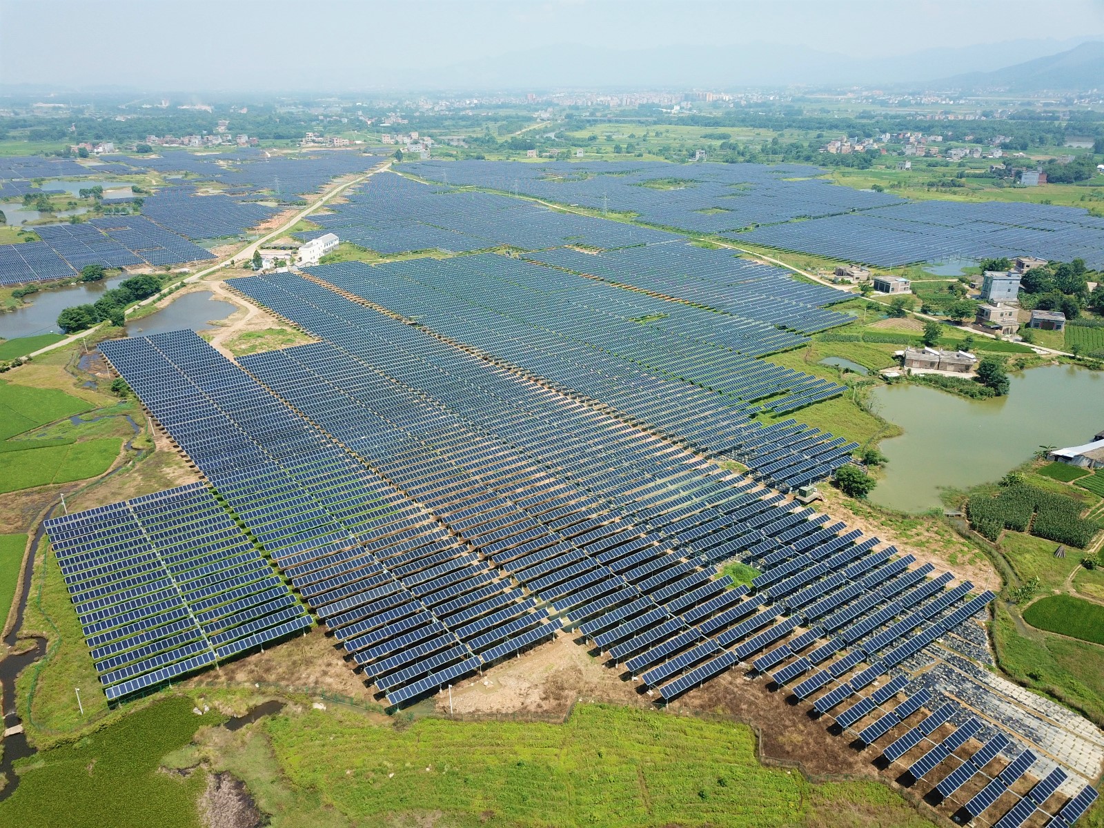 在廣西壯族自治區桂平市中部偏西,坡地上一大片高高架起的光伏藍板排列有序、十分顯眼,空中俯瞰猶如一汪藍色海洋,蔚為壯觀,與四周環繞的綠色田野構成了一幅壯美和諧的生態畫卷。