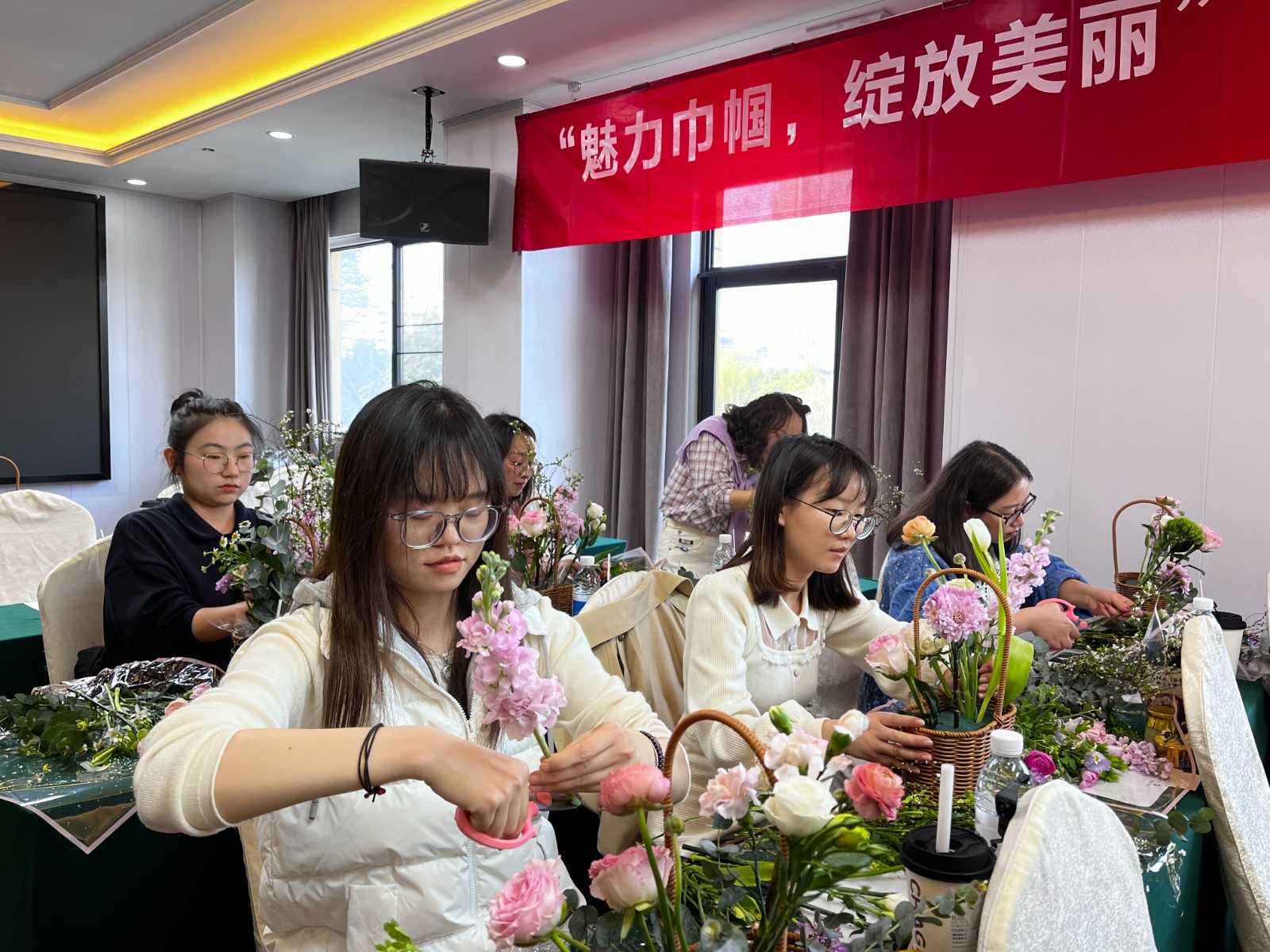 緊接著組織了DIY插花活動,邀請專業(yè)花藝師現(xiàn)場講解鮮花常識、色彩搭配、保鮮方法、花枝修剪和插花的基本技巧。在花藝師指導下,大家躍躍欲試,邊學邊交流,紛紛行動起來,開啟鮮花“綻放”之旅,現(xiàn)場春意盎然、熱鬧非凡,一雙雙巧手將各色花卉配以枝葉點綴,讓一把把散落的花材變成了美麗靈動又具有個性特色的花藝作品,大家喜笑顏開,擁抱著自己精心制作的花籃合影留念。