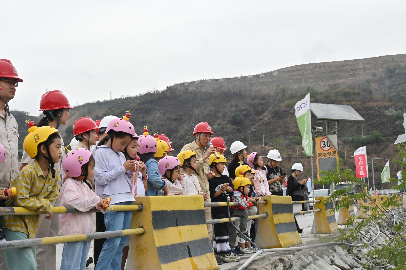 徐孝剛書記帶領小朋友們在觀景平臺俯瞰銀江工地,不時俯下身子,以簡單有趣、深入淺出的語言,讓小朋友們領悟了工程的艱辛歷程和電能的來之不易,提醒大家要培養節約用電的意識。最后,孩子們來到上游圍堰,近距離參觀了建設中的銀江水電站大壩。孩子們被壯觀的“鋼筋混凝土巨人”深深震撼,現場不時爆發出孩子們的掌聲和歡呼聲,為平時繁忙的銀江工地平添了一份生機和活力。