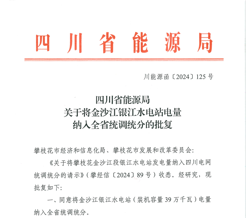 8月27日,在四川省能源局、攀枝花市有關(guān)部門(mén)和川投能源的指導(dǎo)幫助下,經(jīng)過(guò)積極對(duì)接、多方協(xié)調(diào),攀水電公司成功取得四川省能源局將銀江水電站電量納入全省統(tǒng)調(diào)統(tǒng)分的批復(fù),為實(shí)現(xiàn)銀江水電站2024年首臺(tái)機(jī)組投產(chǎn)發(fā)電目標(biāo)再增“助推器”。
