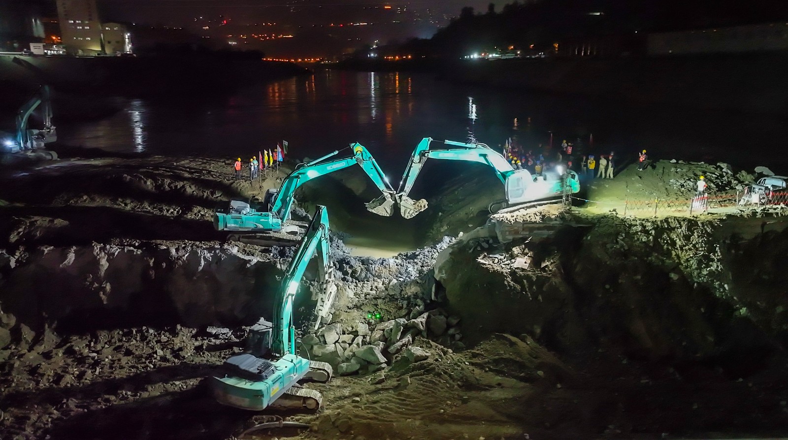 金秋十月,川投能源銀江水電站工程建設(shè)“進(jìn)度條”持續(xù)刷新。10月25日晚上,隨著川投能源副總經(jīng)理、導(dǎo)流明渠截流指揮長(zhǎng)徐孝剛一聲令下,十余臺(tái)挖掘機(jī)在二期上游圍堰右岸進(jìn)行破口開挖,奔騰的金沙江水隨即涌入主河床廠房與溢流壩上游,充水平壓后江水經(jīng)溢流壩段流向下游,銀江水電站成功實(shí)現(xiàn)分流。這一重要進(jìn)展為按期完成導(dǎo)流明渠截流打下堅(jiān)實(shí)基礎(chǔ),也標(biāo)志著銀江水電站首臺(tái)機(jī)組投產(chǎn)發(fā)電正式進(jìn)入倒計(jì)時(shí)階段。