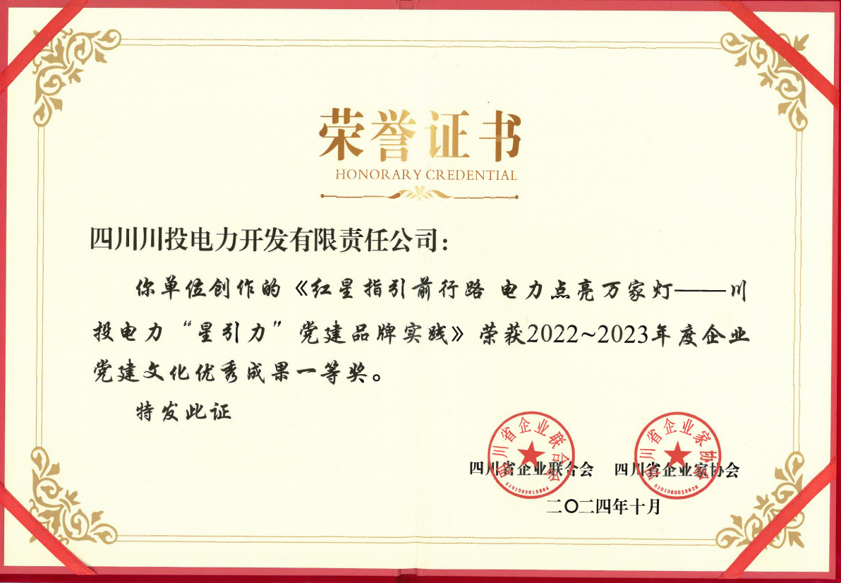 2024年以來,川投電力黨委黨建品牌“星引力”在川投能源黨委的指導(dǎo)下,先后榮獲川投集團(tuán)第四批特色黨建品牌,《中國企業(yè)報(bào)》集團(tuán)、紅旗出版社、北京大學(xué)馬克思主義學(xué)院聯(lián)合頒發(fā)的“2024年度全國企業(yè)黨建創(chuàng)新優(yōu)秀案例(黨建品牌案例)”,四川省企業(yè)聯(lián)合會(huì)、四川省企業(yè)家協(xié)會(huì)聯(lián)合頒發(fā)的“2022-2023年度黨建文化優(yōu)秀成果一等獎(jiǎng)”等榮譽(yù)。